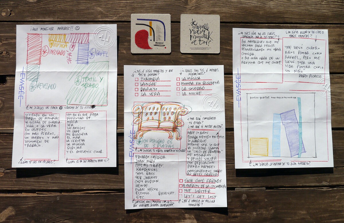 ¡Hola Monsieur Mazurek! - ¿Cómo te ves en 10 años? Viviendo en un pueblo de Asturias, la sierra de Guadalajara o la vera de Cáceres. Con más perros, un huerto y más volumen de trabajo. - ¿Cómo es un día perfecto para tí? Uno en el que pueda disfrutar de Mireia, Lea, los amigos, un café, mi bicicleta, el mar, la cerveza, la música, dibujar y el Athletic Club. - ¿Tus 4 sitios favoritos y que más te inspiren? Torimbia, Langre, Barayo, La Vera. - ¿Cuales son tus 4 mayores inspiraciones? La música, montar en bicicleta, la soledad, la noche. - ¿Por qué comenzaste en esto? Hace 10 años estuve metido en esto, lo aparqué. Intenté ser lo que la sociedad llama un “chico de provecho”. Me negaron y decidí volver con dedicación plena y mayores conocimientos sobre artes gráficas. - ¿Qué artistas vivos o muertos con los que te hubiera gustado colaborar? Eduardo Chillida, Joan Miró, Antoni Tápies, Kandinsky, Saul Bass, Seb Jarnot, Cody Hudson, Hense, Evan Hecox, El Tono, Basquiat… - ¿Por qué cosas cambiarías una de tus obras? Por materiales que me permitan seguir desarrollando mi obra, comida o por otra obra de un artista que me guste. - ¿Alguna de tus citas o frases favoritas? “Me llevó 4 años pintar como Rafael, pero me llevó toda una vida pintar como un niño”. Pablo Picasso